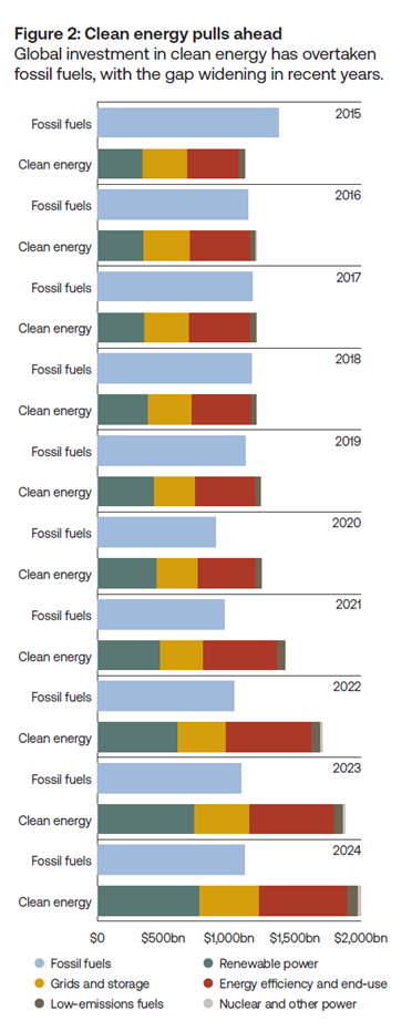 Renewable technologies continue to benefit from powerful learning curves. Record levels of capital investment are reinforcing these dynamics each year. Paradoxically, the very events that appear to strengthen the fossil fuel sector in the short term often accelerate the forces that weaken it over the longer term. For investors looking beyond the immediate cycle, the opportunities created by the energy transition are likely to reside less in the fuels being displaced and more in the systems and infrastructure that enable the new energy economy to function.