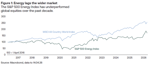 The performance of global equities over the past decade illustrates this dynamic clearly. Over the ten years to March 2026, the global equity market delivered significantly better returns than from the energy sector alone (as shown in figure 1).